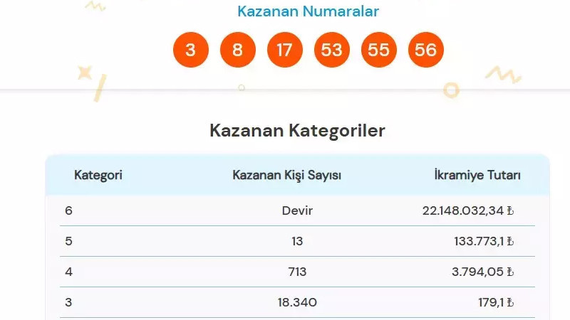 6 bilen çıkmadı ve 22 milyon148 bin 032,34 TL devretti.5 bilen 13 kişi 133 bin 773,1 ₺4 bilen 713 kişi 3 bin 794,05 ₺3 bilen 18 bin 340 kişi 179,1 ₺2 bilen 171 bin 360 kişi 20,25 ₺